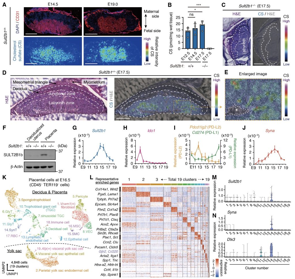 Although placental mammals are at high risk of maternal–fetal immune conflict, it is unclear how the semi-allogeneic fetus avoids rejection. Cholesterol sulfate (CS) is a bioactive metabolite that inhibits leukocyte migration and activation. This study investigated the roles and cells associated with CS in pregnant mice and humans. CS was sequentially produced by maternal-derived endometrial cells and fetal-derived placental trophoblasts before and after placentation. When mated with allogeneic males, CS-deficient mice showed increased fetal resorption rates under induced placental inflammation. This phenotype disappeared when the activity of the CS-producing enzyme was restored in the placenta. Placental CS levels were reduced in patients with “villitis of unknown etiology.” Thus, we uncovered the spatiotemporal control of CS production and its relevance to local immunosuppression during pregnancy.