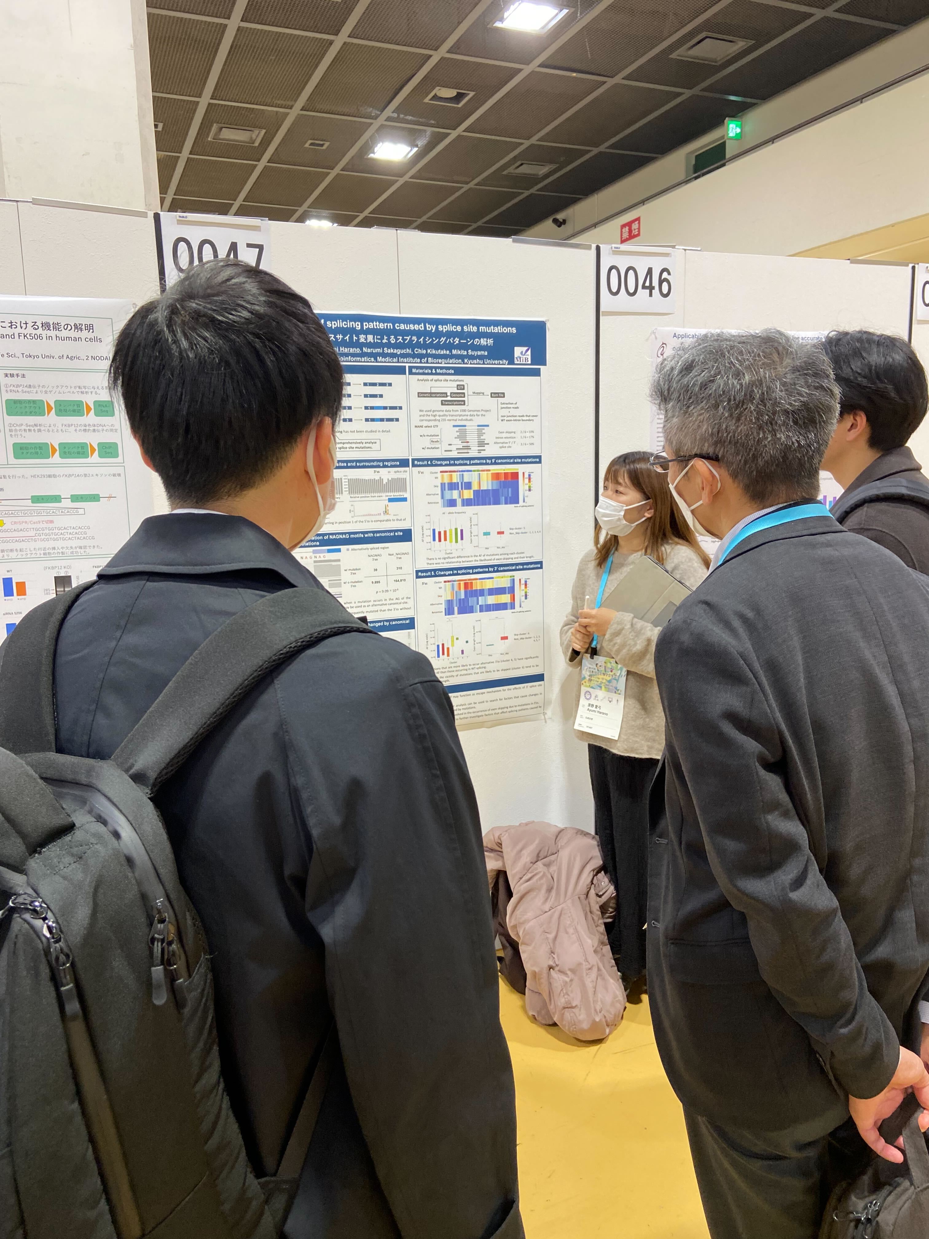 | 「第46回日本分子生物学会年会」に参加しました。 | ポスター発表演題 菊竹さん:「がんの進化に関与しうるサイレント変異の網羅的解析」 邵さん:「初期胚のトランスクリプトームにおけるHDAC阻害剤の影響の解明」 原野さん:「個人ゲノム及びトランスクリプトームデータを用いたスプライスサイト変異によるスプライシングパターン変化の解析」 曲さん:「Indelを含めたスプライス部位形成変異によるexon extension/shrinkageイベントの網羅的探索」 出口さん:「乳がんのサブタイプ特異的な選択的スプライシングパターンの特定」 |
