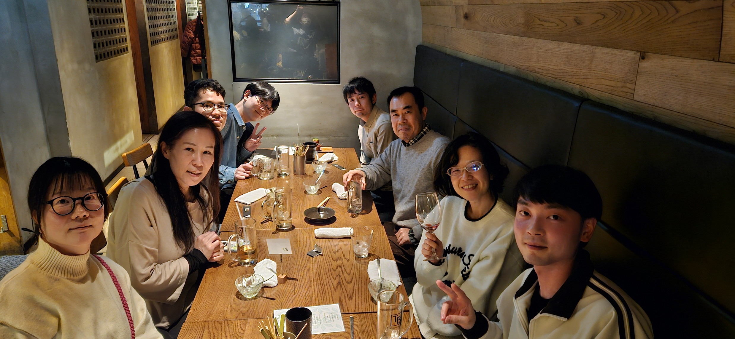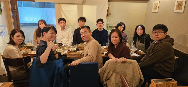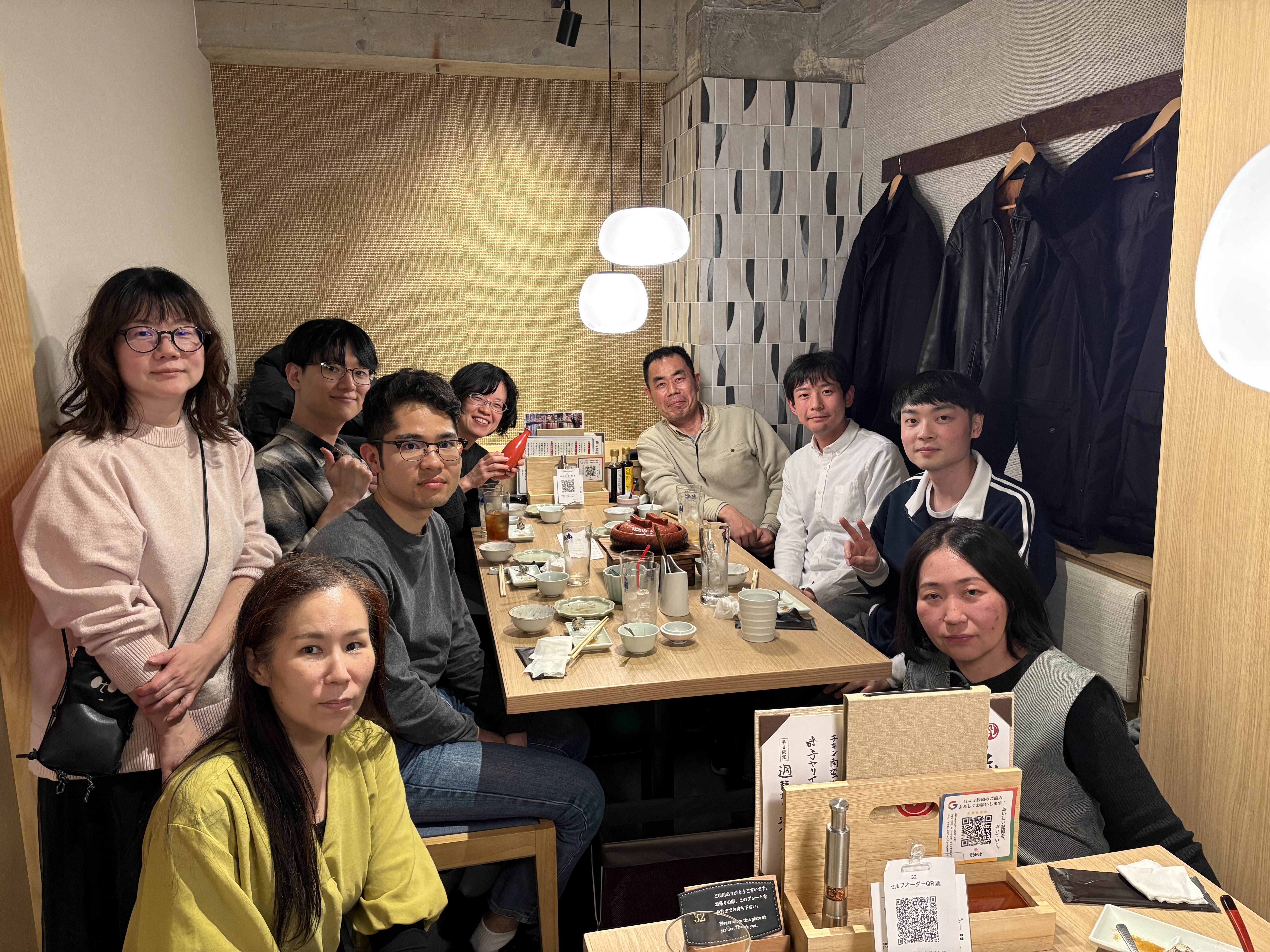 - 久しぶりの飲み会(歓送迎会)!博士課程のファン君、修士課程の西君、技術補佐員の山内さん・小田さんが加わりました!湯通堂さん、お疲れ様でした!